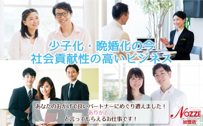 結婚相談所の開業は副業としても始めやすく、定年後のビジネスとしても人気が出てきています。人の繋がりが減ってきている現代だからこそ、この先必要とされる仕事ではないでしょうか。結婚相談所を副業として始める人が多いのは、エステ経営者や、着物・ドレスのレンタルショップ、飲食経営者など、今の仕事と婚活ビジネスを絡めて行う人が多いようです。今までの人脈が有るなら、今後の宣伝もしやすくなります。